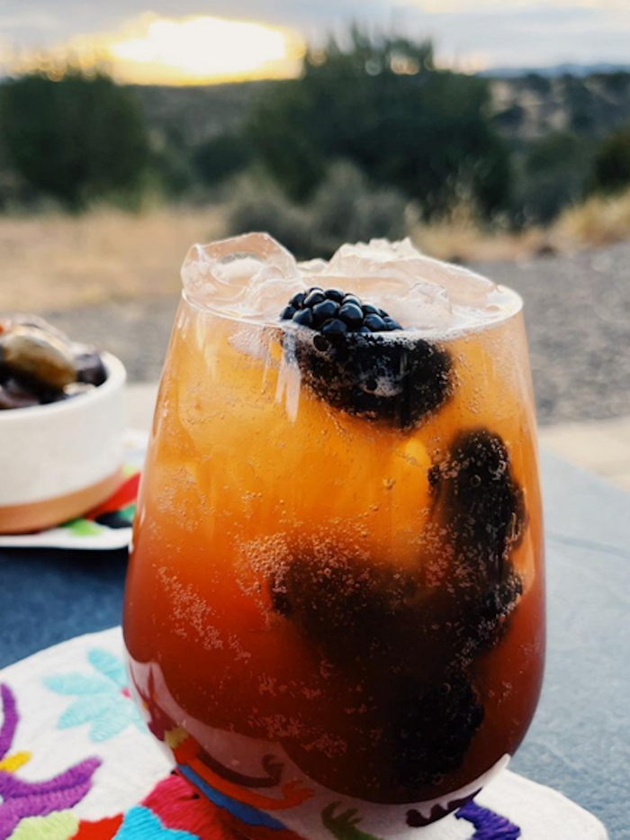 Fill an 8-oz glass with ice. Add 1/3 Pomegranate Bergamot, 1/2 Kombucha, and 1/3 Seltzer. Add ½ tsp bitters, if using. Stir gently and top with blackberries.